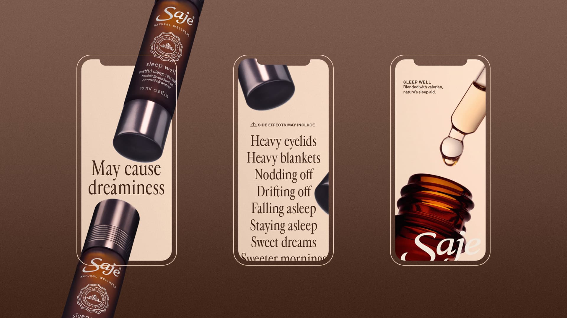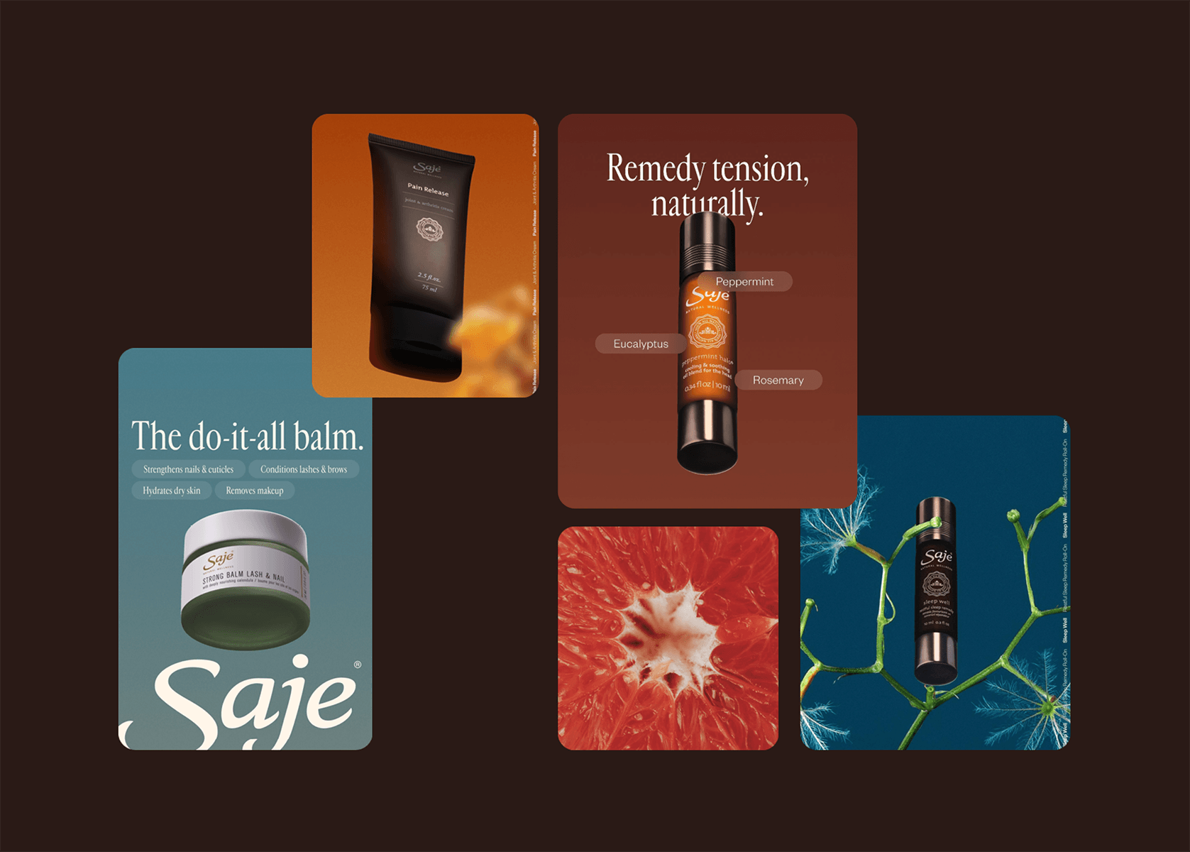 A brand transformation for Saje, a Canadian health and wellness brand, focused on using the natural power of plants to address modern discomforts. The new design system highlights the brand’s signature brown bottles, adding meaning and ownership to its identity. We used browns, greens, and jewel tones to reflect boldness, incorporating Rx-inspired visuals and prescription bottle labels to better showcase the products. The approach is editorial, candid, and raw, replacing the typical zen aesthetic with a refreshing sense of humour and modern sensibility.